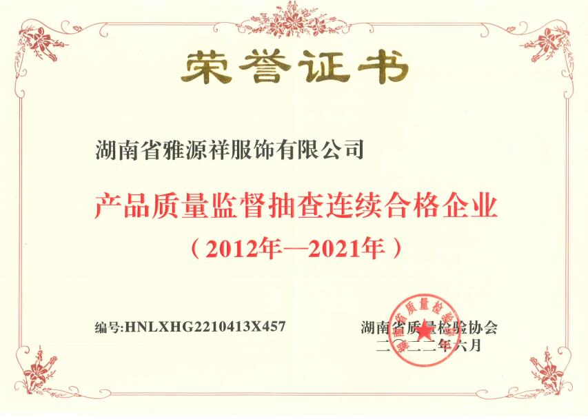 產品質量監督抽查連續合格...
